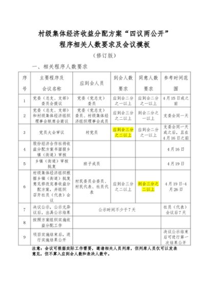 【七哥公文】2024年:村级集体经济收益分配方案“四议两公开”程序相关人数要求及会议模板+更多免费公文+VX:QiGeGongWen2024