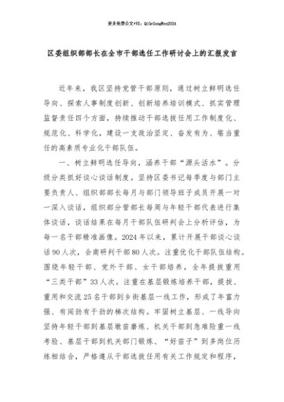 【七哥公文】2024年:区委组织部部长在全市干部选任工作研讨会上的汇报发言+更多免费公文+VX:QiGeGongWen2024