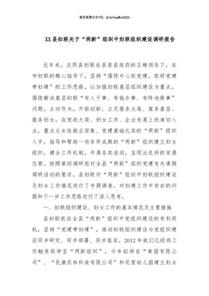 / 【七哥公文】2024年:XX县妇联关于“两新”组织中妇联组织建设调研报告+更多免费公文+VX:QiGeGongWen2024