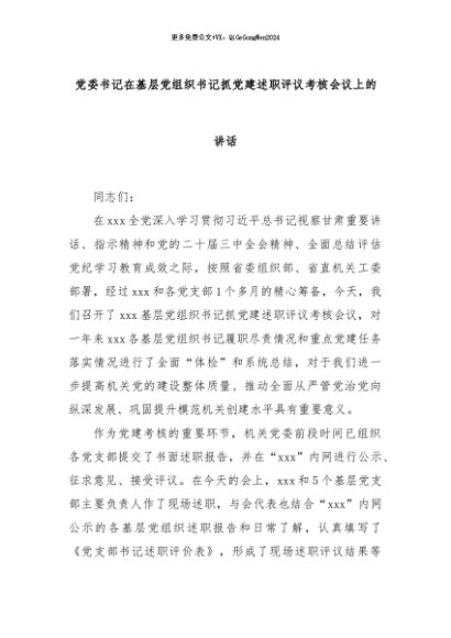 【七哥公文】2024年:党委书记在基层党组织书记抓党建述职评议考核会议上的讲话+更多免费公文+VX:QiGeGongWen2024