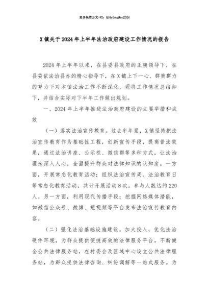 【七哥公文】2024年:X镇关于2024年上半年法治政府建设工作情况的报告+更多免费公文+VX:QiGeGongWen2024