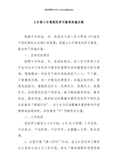 【七哥公文】2024年:X乡深入开展党纪学习教育实施方案+更多免费公文+VX:QiGeGongWen2024