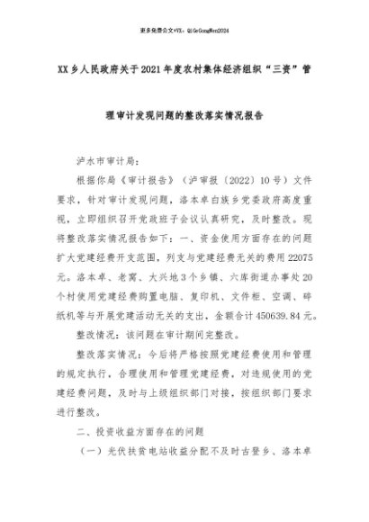 【七哥公文】2024年:XX乡人民政府关于202X年度农村集体经济组织“三资”管理审计发现问题的整改落实情况报告+更多免费公文+VX:QiGeGongWen2024