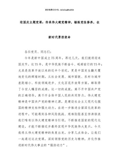【七哥公文】2024年:迎国庆主题党课:传承伟大建党精神,锤炼党性修养,在新时代勇担使命+更多免费公文+VX:QiGeGongWen2024
