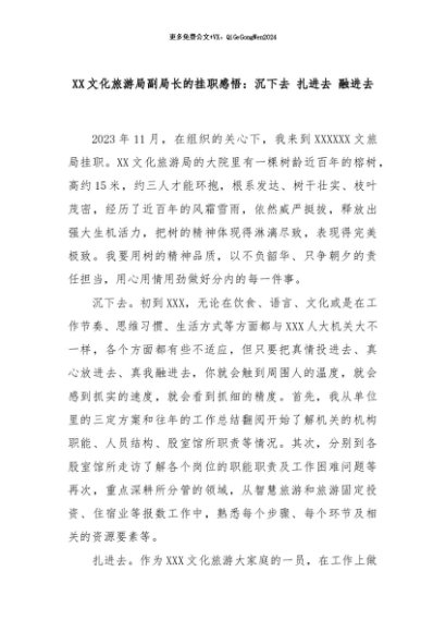 【七哥公文】2024年:XX文化旅游局副局长的挂职感悟:沉下去 扎进去 融进去+更多免费公文+VX:QiGeGongWen2024