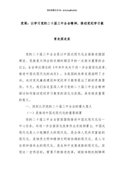 【七哥公文】2024年:党课:以学习党的二十届三中全会精神,推动党纪学习教育走深走实+更多免费公文+VX:QiGeGongWen2024