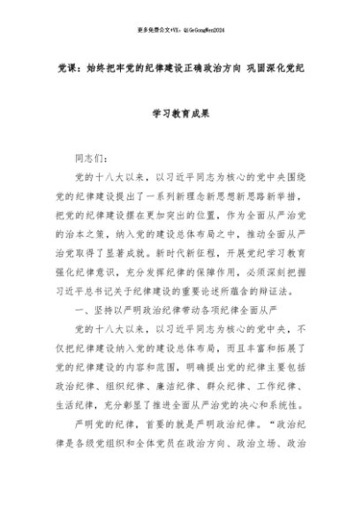 【七哥公文】2024年:党课:始终把牢党的纪律建设正确政治方向 巩固深化党纪学习教育成果+更多免费公文+VX:QiGeGongWen2024