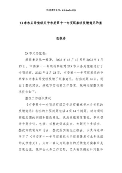 【七哥公文】2024年:XX市水务局党组关于市委第十一专项巡察组反馈意见的整改报告+更多免费公文+VX:QiGeGongWen2024