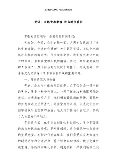 / 【七哥公文】2024年:党课:点燃青春激情 担当时代重任+更多免费公文+VX:QiGeGongWen2024