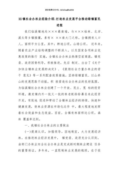 【七哥公文】2024年:XX镇社会办林业经验介绍:打造林业发展平台推动绿镇富民进程+更多免费公文+VX:QiGeGongWen2024