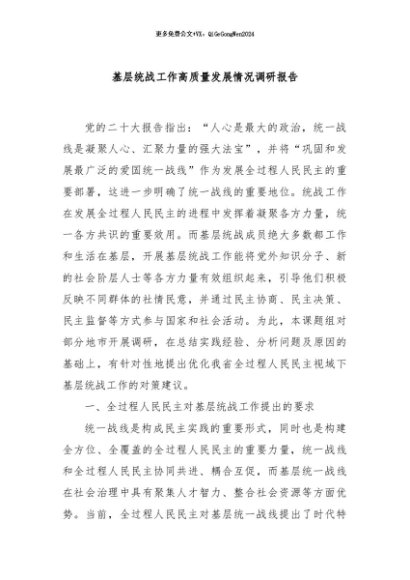 / 【七哥公文】2024年:基层统战工作高质量发展情况调研报告+更多免费公文+VX:QiGeGongWen2024