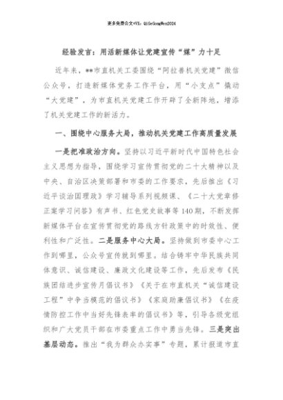 / 【七哥公文】2024年:经验发言:用活新媒体让党建宣传“媒”力十足+更多免费公文+VX:QiGeGongWen2024