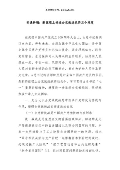 / 【七哥公文】2024年:党课讲稿:新征程上推进全党做统战的三个维度+更多免费公文+VX:QiGeGongWen2024
