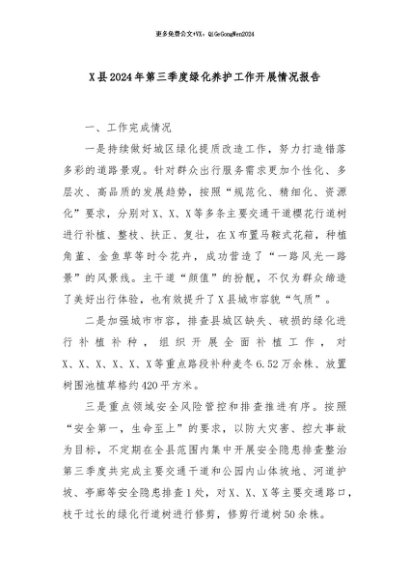 / 【七哥公文】2024年:X县2024年第三季度绿化养护工作开展情况报告+更多免费公文+VX:QiGeGongWen2024