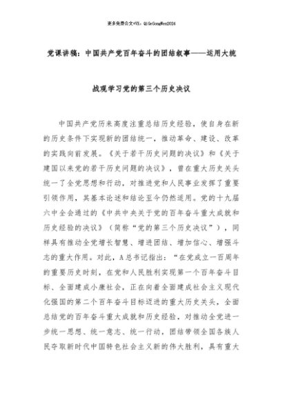 【七哥公文】2024年:党课讲稿:中国共产党百年奋斗的团结叙事——运用大统战观学习党的第三个历史决议+更多免费公文+VX:QiGeGongWen2024