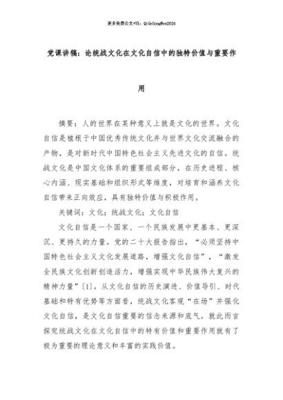 【七哥公文】2024年:党课讲稿:论统战文化在文化自信中的独特价值与重要作用+更多免费公文+VX:QiGeGongWen2024