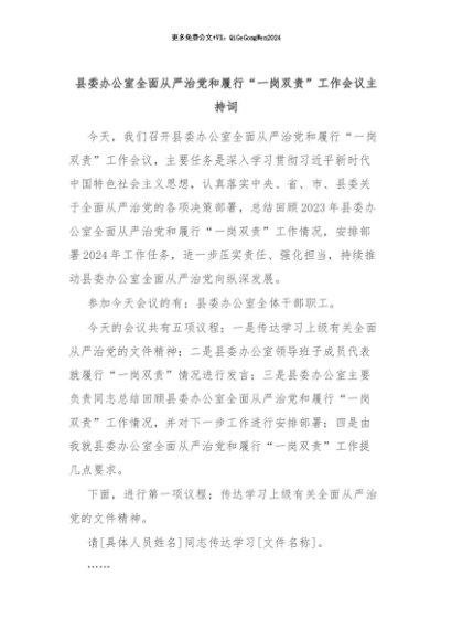 【七哥公文】2024年:县委办公室全面从严治党和履行“一岗双责”工作会议主持词+更多免费公文+VX:QiGeGongWen2024