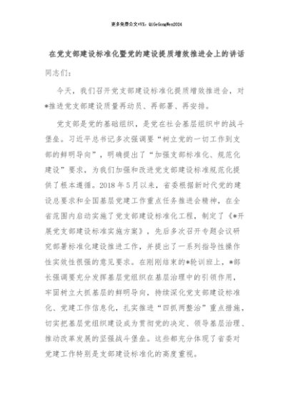 【七哥公文】2024年:在党支部建设标准化暨党的建设提质增效推进会上的讲话+更多免费公文+VX:QiGeGongWen2024