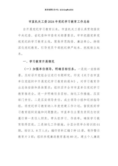 / 【七哥公文】2024年:市直机关工委2024年党纪学习教育工作总结+更多免费公文+VX:QiGeGongWen2024