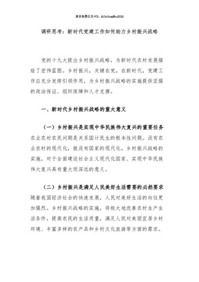 / 【七哥公文】2024年:调研思考:新时代党建工作如何助力乡村振兴战略+更多免费公文+VX:QiGeGongWen2024