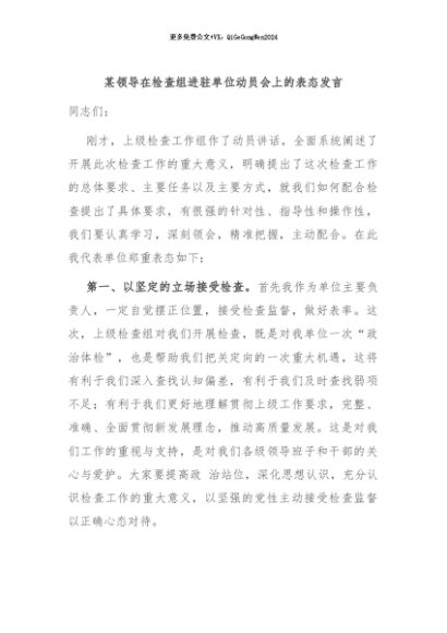 / 【七哥公文】2024年:某领导在检查组进驻单位动员会上的表态发言+更多免费公文+VX:QiGeGongWen2024