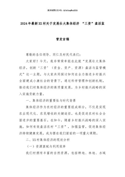 【七哥公文】2024年:2024年最新XX村关于发展壮大集体经济 “三资”盘活监管发言稿+更多免费公文+VX:QiGeGongWen2024