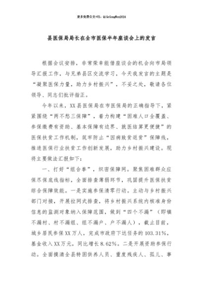 / 【七哥公文】2024年:县医保局局长在全市医保半年座谈会上的发言+更多免费公文+VX:QiGeGongWen2024