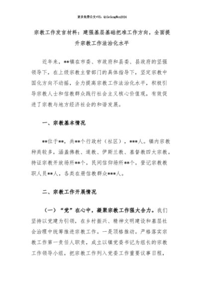 【七哥公文】2024年:宗教工作发言材料:建强基层基础把准工作方向,全面提升宗教工作法治化水平+更多免费公文+VX:QiGeGongWen2024
