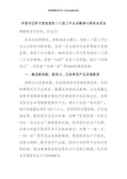 【七哥公文】2024年:市委书记学习贯彻党的二十届三中全会精神心得体会发言+更多免费公文+VX:QiGeGongWen2024