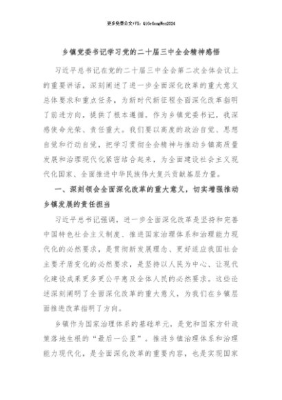 / 【七哥公文】2024年:乡镇党委书记学习党的二十届三中全会精神感悟+更多免费公文+VX:QiGeGongWen2024