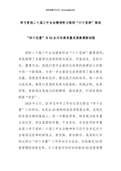 【七哥公文】2024年:学习贯彻二十届三中全会精神努力做到“六个坚持”推进“四个注重”为XX全方位高质量发展集聚新动能+更多免费公文+VX:QiGeGongWen2024