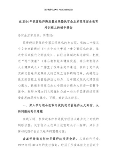 【七哥公文】2024年:在2024年民营经济高质量发展暨民营企业家理想信念教育培训班上的辅导报告+更多免费公文+VX:QiGeGongWen2024