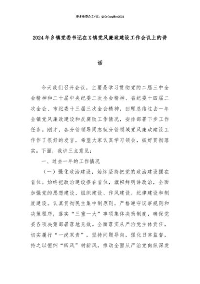 【七哥公文】2024年:2024年乡镇党委书记在X镇党风廉政建设工作会议上的讲话+更多免费公文+VX:QiGeGongWen2024