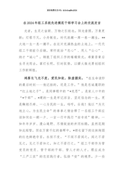 / 【七哥公文】2024年:在2024年组工系统先进模范干部学习会上的交流发言+更多免费公文+VX:QiGeGongWen2024