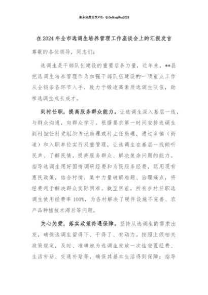 【七哥公文】2024年:在2024年全市选调生培养管理工作座谈会上的汇报发言+更多免费公文+VX:QiGeGongWen2024
