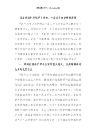 / 【七哥公文】2024年:基层党组织书记学习党的二十届三中全会精神感悟+更多免费公文+VX:QiGeGongWen2024