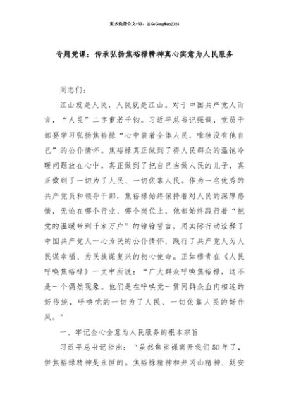 / 【七哥公文】2024年:专题党课:传承弘扬焦裕禄精神真心实意为人民服务+更多免费公文+VX:QiGeGongWen2024