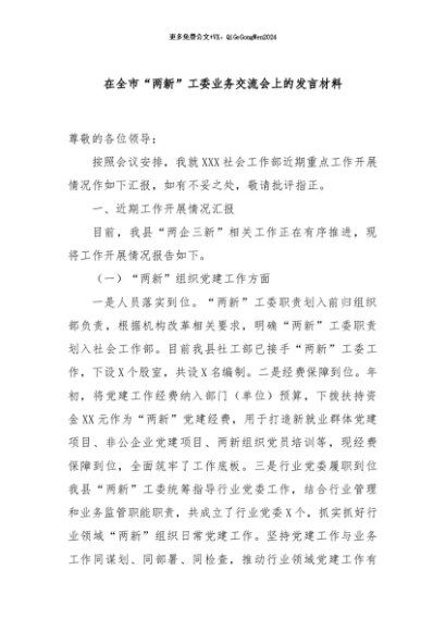 / 【七哥公文】2024年:在全市“两新”工委业务交流会上的发言材料+更多免费公文+VX:QiGeGongWen2024