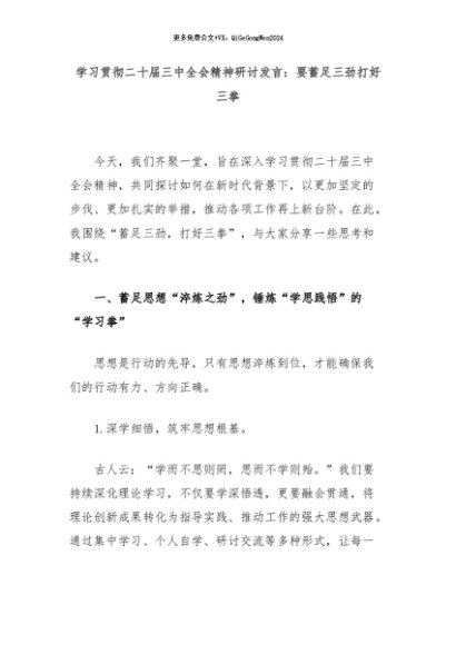 【七哥公文】2024年:学习贯彻二十届三中全会精神研讨发言:要蓄足三劲打好三拳+更多免费公文+VX:QiGeGongWen2024