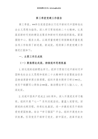 / 【七哥公文】2024年:第三季度党建工作报告+更多免费公文+VX:QiGeGongWen2024