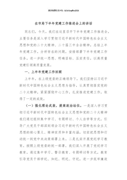 / 【七哥公文】2024年:在市局下半年党建工作推进会上的讲话+更多免费公文+VX:QiGeGongWen2024