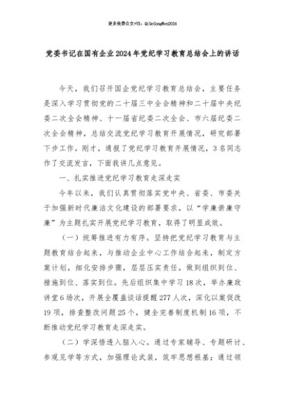 【七哥公文】2024年:党委书记在国有企业2024年党纪学习教育总结会上的讲话+更多免费公文+VX:QiGeGongWen2024