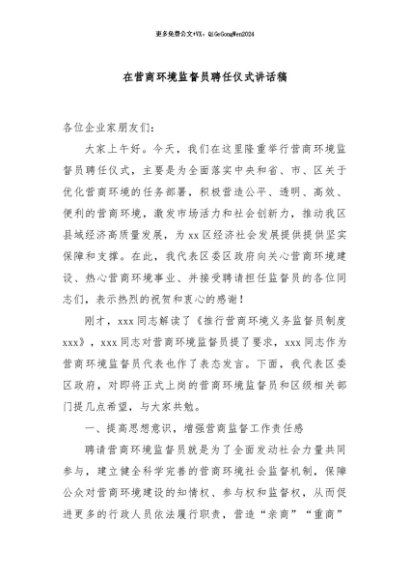 / 【七哥公文】2024年:在营商环境监督员聘任仪式讲话稿+更多免费公文+VX:QiGeGongWen2024