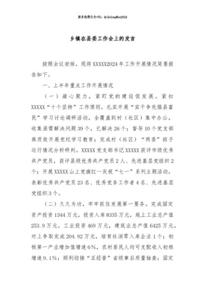 / 【七哥公文】2024年:乡镇在县委工作会上的发言+更多免费公文+VX:QiGeGongWen2024