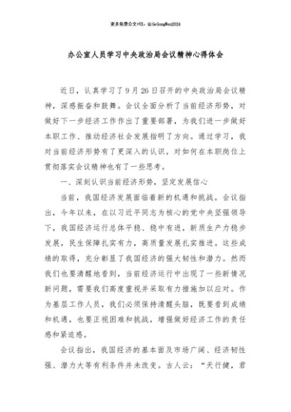 / 【七哥公文】2024年:办公室人员学习中央政治局会议精神心得体会+更多免费公文+VX:QiGeGongWen2024