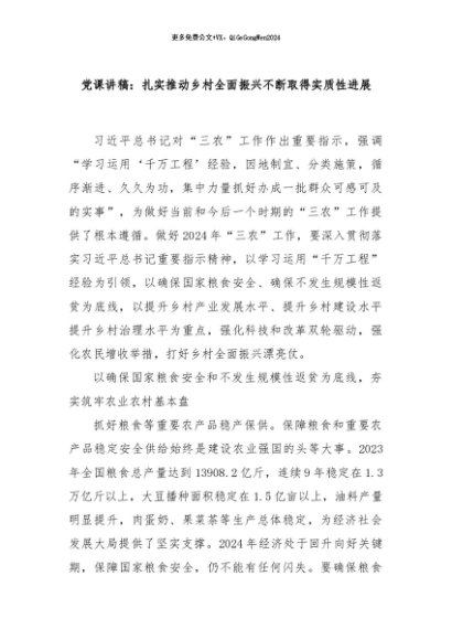 / 【七哥公文】2024年:党课讲稿:扎实推动乡村全面振兴不断取得实质性进展+更多免费公文+VX:QiGeGongWen2024