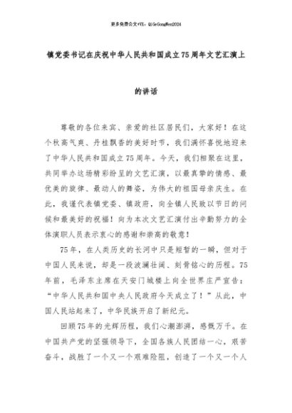 【七哥公文】2024年:镇党委书记在庆祝中华人民共和国成立75周年文艺汇演上的讲话+更多免费公文+VX:QiGeGongWen2024