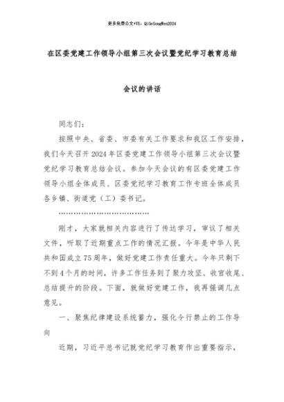 【七哥公文】2024年:在区委党建工作领导小组第三次会议暨党纪学习教育总结会议的讲话+更多免费公文+VX:QiGeGongWen2024