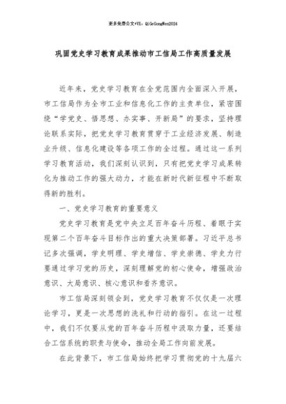 / 【七哥公文】2024年:巩固党史学习教育成果推动市工信局工作高质量发展+更多免费公文+VX:QiGeGongWen2024