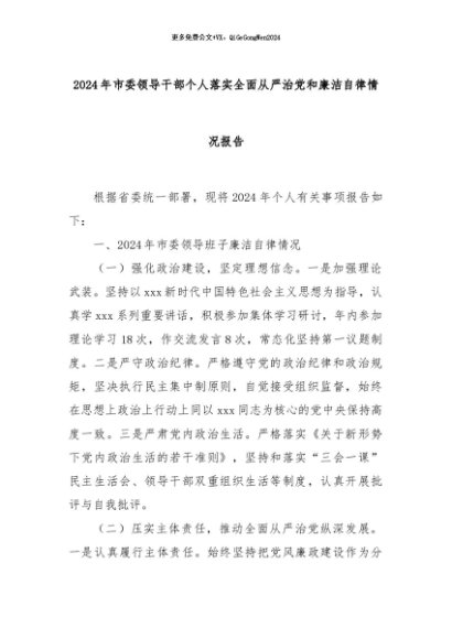 【七哥公文】2024年:2024年市委领导干部个人落实全面从严治党和廉洁自律情况报告+更多免费公文+VX:QiGeGongWen2024